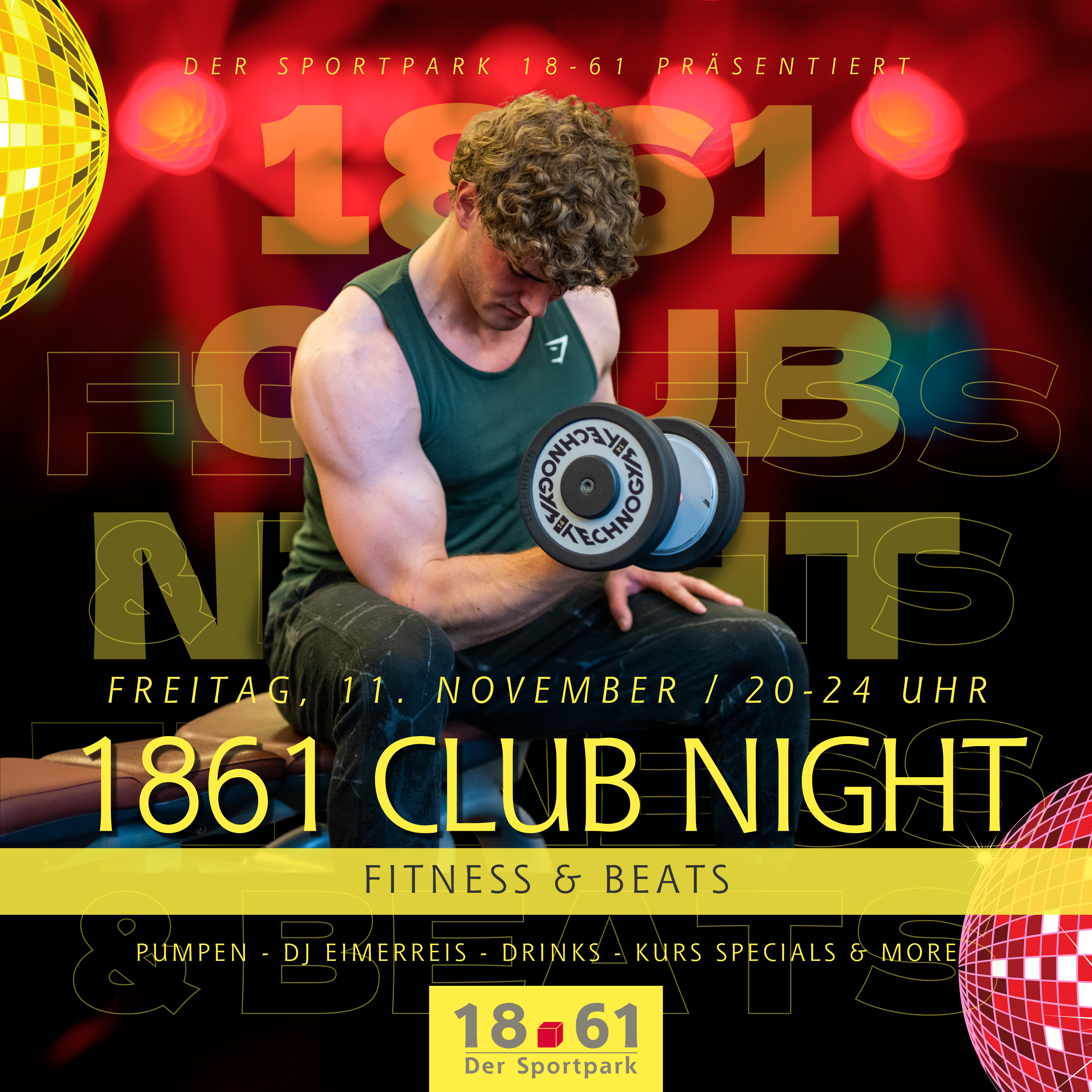 Zu Beats von DJ eimerreis wollen wir an diesem Abend von 20-24 Uhr gemeinsam trainieren und feiern. Gespannt sein lohnt sich: Es erwarten euch viele Specials rund um Sport und Feiern. Lasst euch überraschen und savet euch jetzt schon den 11. November für eine Party bei uns!