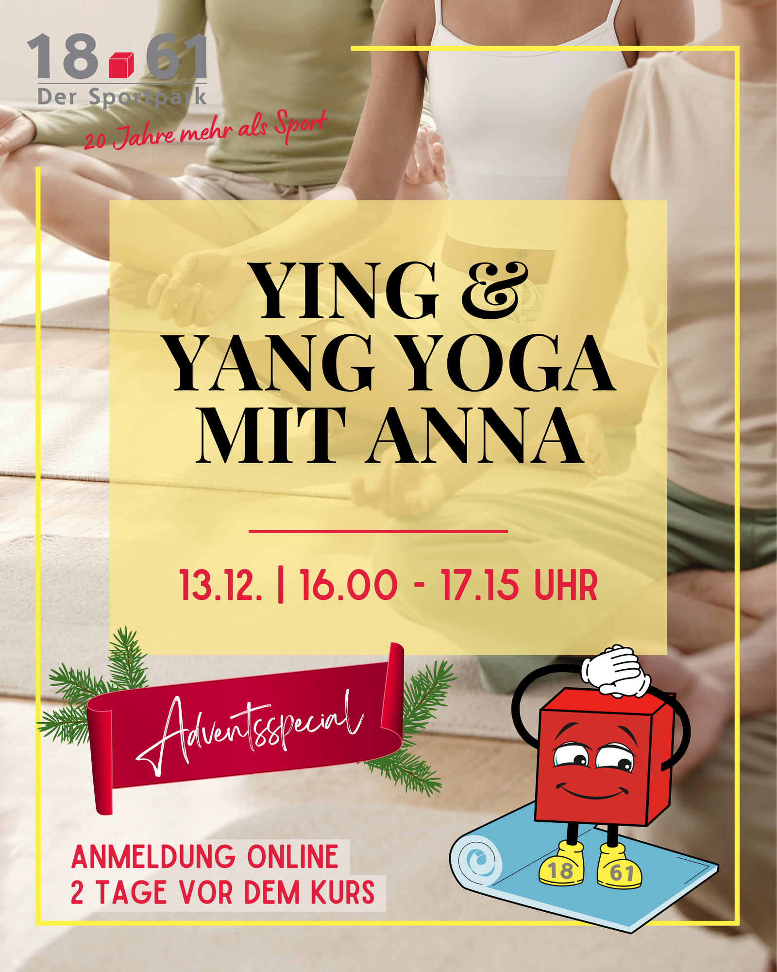 „In der Ruhe liegt die Kraft - Yin & YangYoga“ - für alle, die sich im Advent bewusst Zeit für sich selbst nehmen möchten. In diesem Kurs werden aktivierende, kraftvolle YangYoga-Elemente mit der sanften, regenerierenden Qualität des YinYoga verbunden. So entsteht eine wohltuende Balance zwischen Aktivität und Entspannung - genau das Richtige, um die Adventszeit achtsam und gelassen zu erleben, neue Energie zu schöpfen und Spannungen zu lösen.