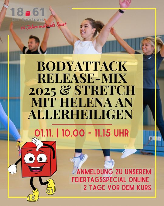 Erlebe ein energiegeladenes BODYATTACK-Workout, das deine Fitness, Ausdauer und Beweglichkeit auf das nächste Level bringt – mit jeder Menge Spaß und Power! Dich erwarten athletische Bewegungen wie Laufen, Ausfallschritte und Sprünge kombiniert mit kräftigenden Übungen wie Push-Ups und Squats. Zum Abschluss sorgt eine wohltuende Stretch-Einheit für den perfekten Ausklang.