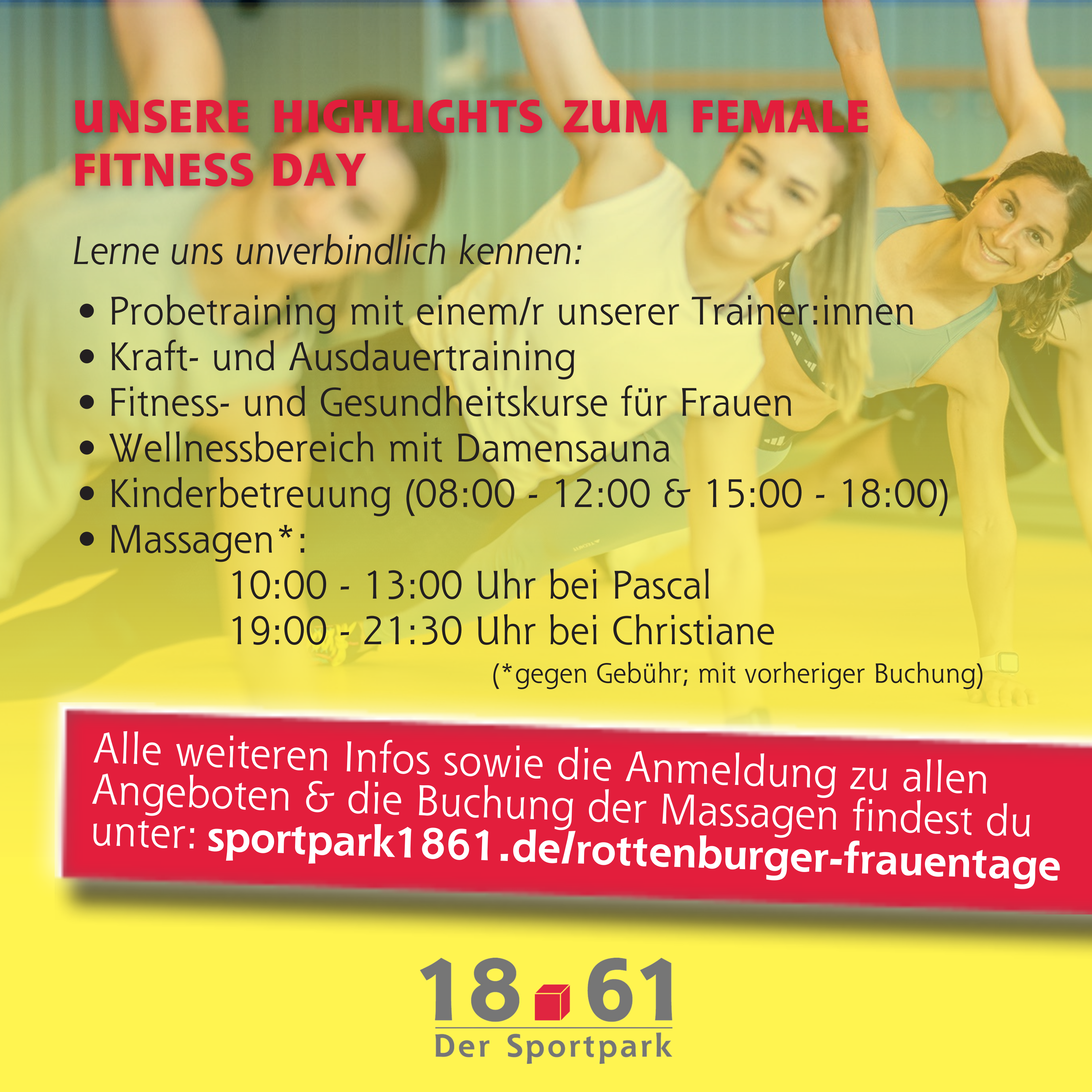 Seid gespannt auf einen Tag voller Fitness, Wellness und Gesundheit für Frauen. Wir freuen uns über alle Frauen, egal ob Mitglieder oder Nicht-Mitglied. Der Female Fitness Day ist besonders für Nicht-Mitglieder der perfekte Tag, den Sportpark 18-61 unverbindlich kennenzulernen.