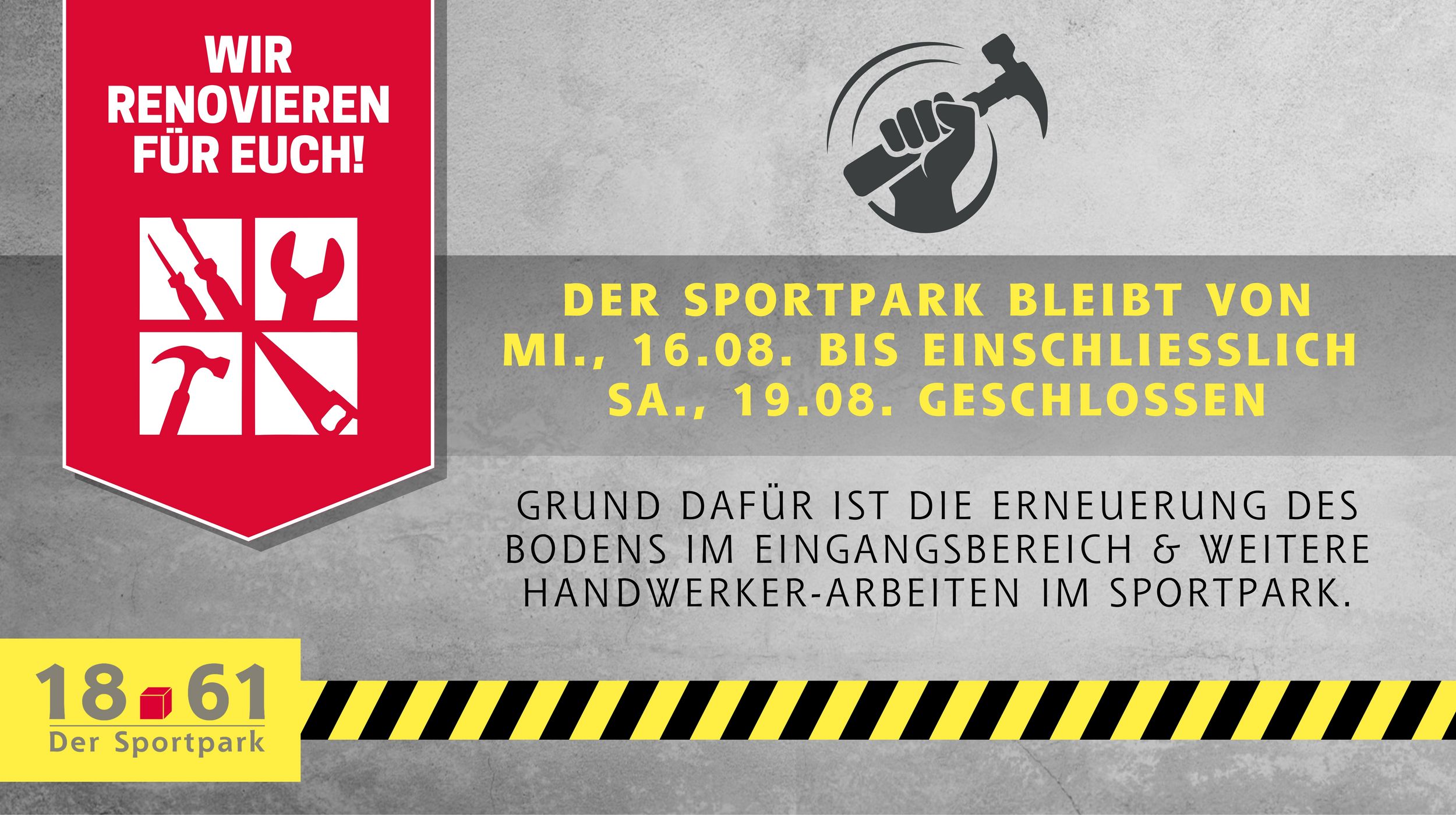 Grund dafür ist die Erneuerung des Bodens im Eingangsbereich und weitere Handwerker-Arbeiten im Sportpark. Der Outdoor-Bereich (Tower, Beach-Felder und Finnenbahn) bleibt zugänglich und es wird eine kleine Auswahl an Outdoorkursen im Zelt geben.