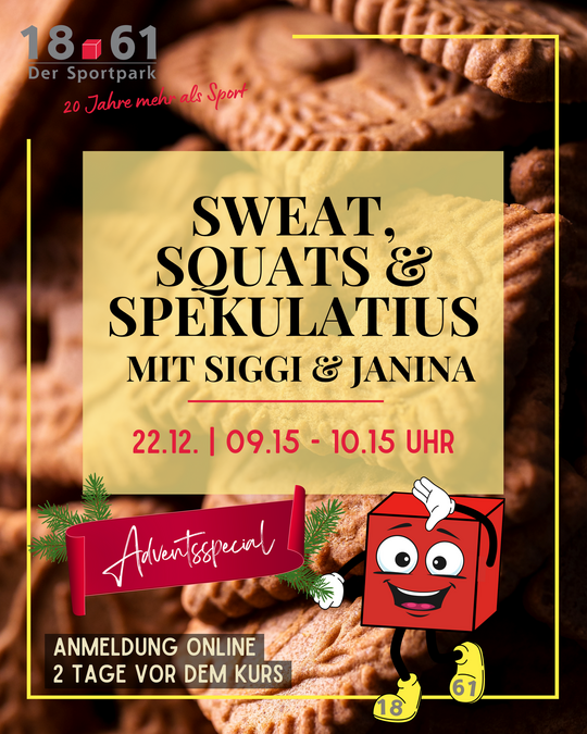 Mit unserem Kurs-Special erlebst du ein schweißtreibendes Workout, das dich fit und fröhlich durch die Feiertage bringt. Gemeinsam mit Siggi und Janina wird es sportlich, spaßig und voller Motivation! Freu dich auf effektive Squats, festliche Energie und vielleicht auch ein kleines bisschen Spekulatius-Belohnung. Vergiss nicht, dich hier anzumelden!