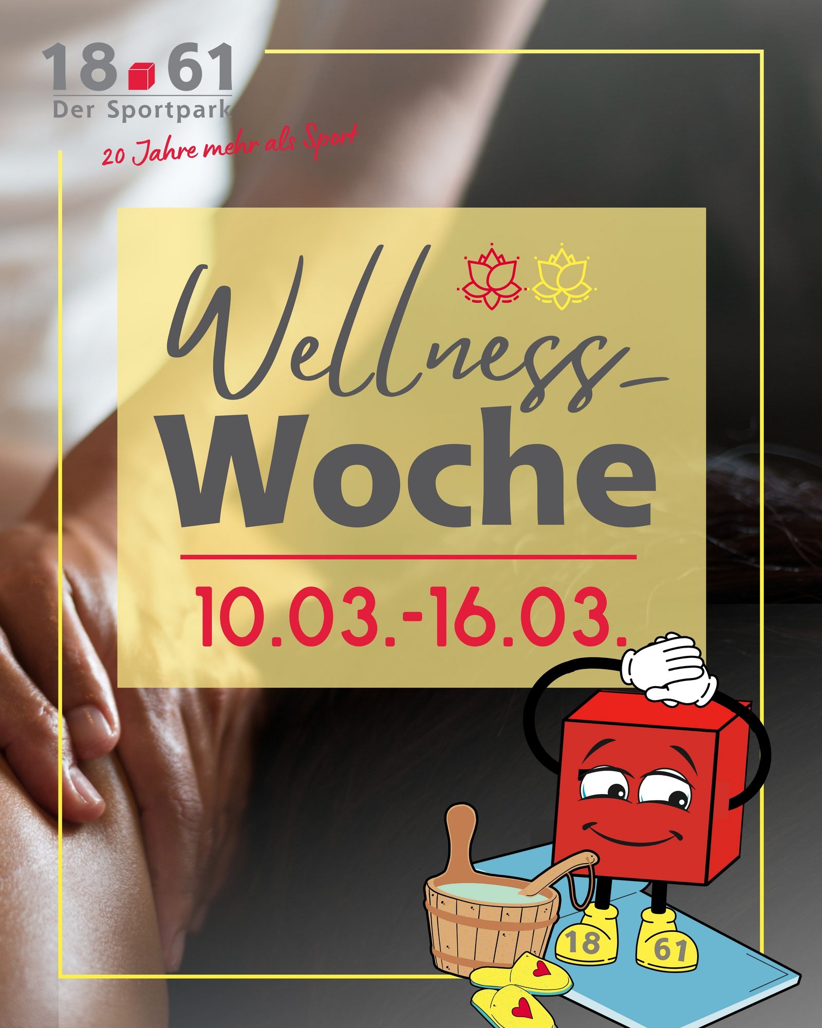 Vom 10.03.25 bis zum 16.03.25 findet wieder unsere Wellnesswoche statt. Nimm dir bewusst Zeit für dich und genieße Entspannung, Erholung und Wellness im Sportpark 18-61. Egal ob in unserem Ruheraum, in unserer Sauna bei revitalisierenden Aufgüssen, bei entspannenden Massagen oder bei einem unserer Gesundheitskurse – diese Woche ist dein Moment, um innezuhalten, aufzutanken und deine Batterien aufzuladen. Lass den Alltagsstress hinter dir und begib dich auf eine Reise der inneren Balance und des Wohlbefindens. Als besonderes Highlight bieten wir dieses Jahr am Sonntag, den 16.03. ein YinYoga-Special.