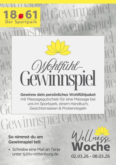 Zum Start unserer Wellness-Woche verlosen wir ein Wohlfühlpaket aus Massagegutschein für eine Massage bei uns im Sportpark, einem Handtuch, Gesichtsmasken & Proteinriegeln.