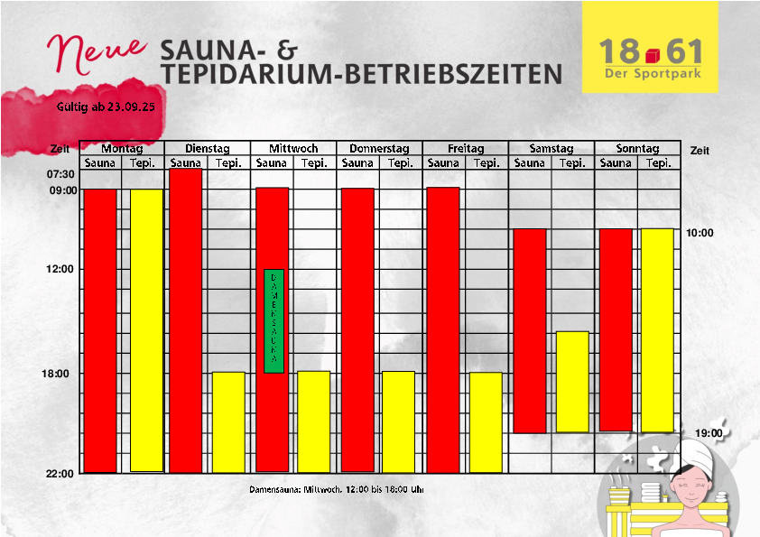 Die Öffnungszeiten der Sauna und des Tepidariums können Sie immer dem aktuellen Sauna-Plan entnehmen.